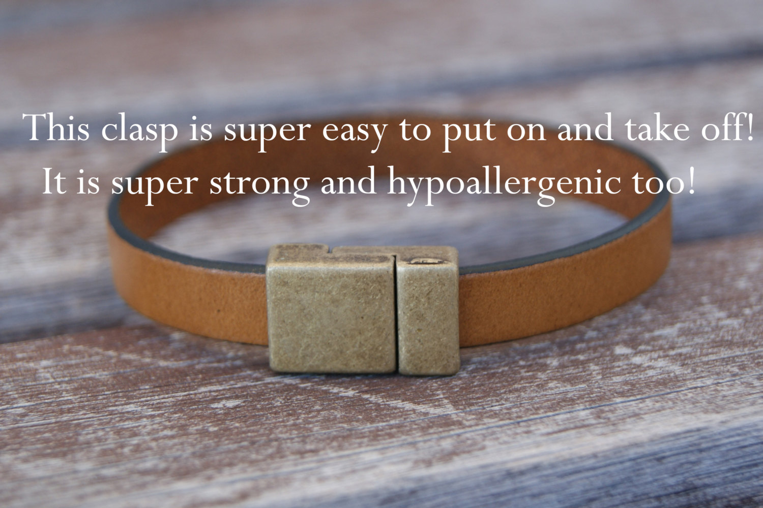 Handmade leather bracelet (10mm) with a strong hypoallergenic magnetic clasps. Made with high quality European genuine leather. Very comfortable & easy to wear.