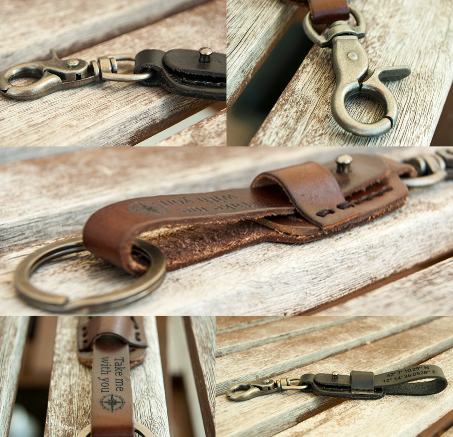 Personalized Keychain handmade and hand stitched with high quality genuine leather. You can request to engrave it with any name / word /coordinates / date, etc. You can also send us a photo of a signature or any symbol and have it engraved into the leather!