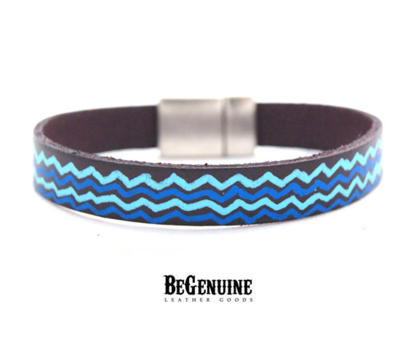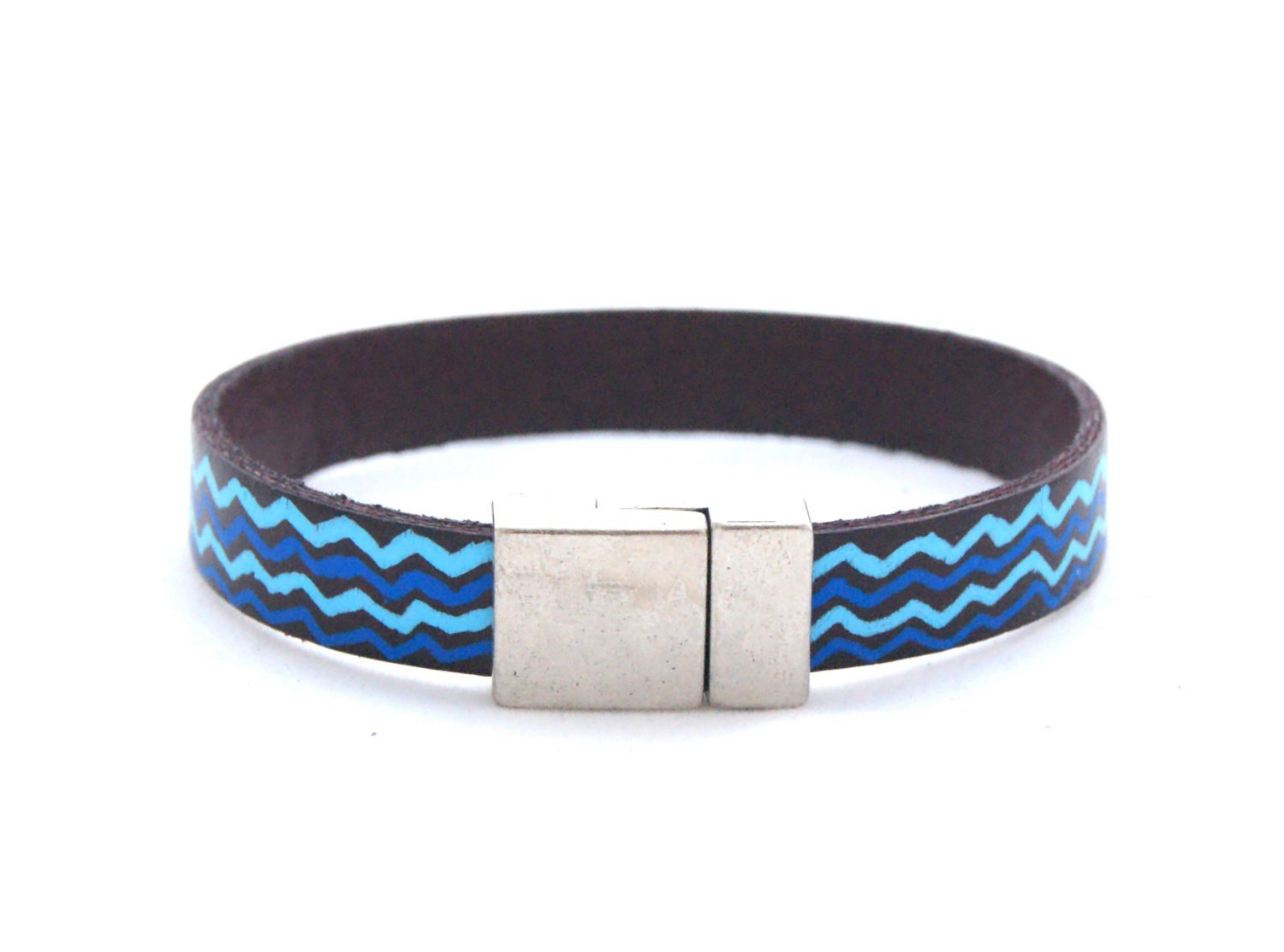Women Boho Leather Bracelet made of Genuine European leather, hand painted with unique, beautiful turquoise chevron pattern! This bracelet is about 10mm (0.4in) and has a strong and easy to use hypoallergenic magnetic clasp. Very comfortable & easy to wear.