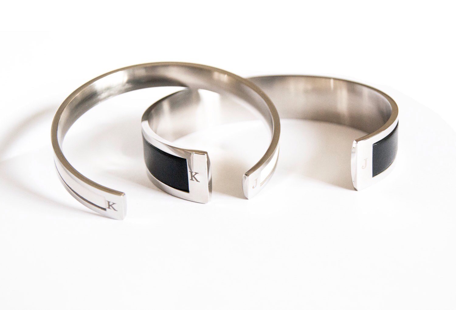 Couples Matching Cuff Bracelets. Set of 2 amazing, unique Stainless Steel cuffs with Genuine Leather Inlay. Made with Genuine high quality European leather and high quality Stainless Steel. Perfect, meaningful, special couples anniversary gift, valentines gift, wedding gift, birthday gift.