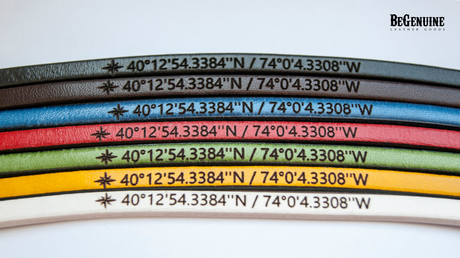 Coordinate Bracelet - beautiful, simple, authentic stainless steel cuff with genuine leather inlay. You can engrave your own coordinates or any other message and make this a perfect, meaningful gift to be cherished for years.